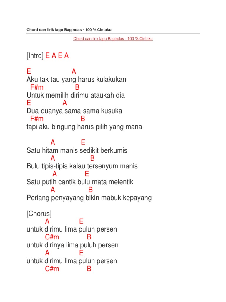 Chord Dan Lirik Lagu Bagindas 100 Cintaku